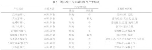 溶 剂废气排放特点主要跟医药化工生产工艺特点有关, 具体表现在(1)排放点多, 排放量大, 无组织排放严重。医药化工产品得率低, 溶剂消耗大, 几乎每台生产设备都是溶剂废