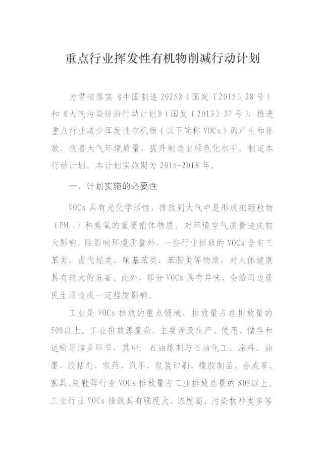 为贯彻落实《中国制造2025》(国发〔2015〕28号)和《大气污染防治行动计划》(国发〔2013〕37号),加快推进落实绿色制造工程实施指南,推进促进重点行业挥发性有机物削减,提升工业绿色发展水平,改善大气环境质量,提升制造业绿色化水平,我们组织编制了《重点行业挥发性有机物削减行动计划》。现印发你们,请遵照执行。