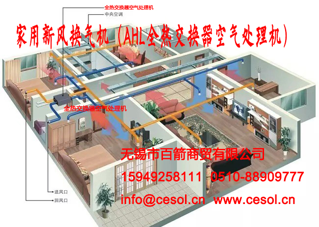 新风系统是根据在密闭的室内一侧用专用设备向室内送新风,再从另一侧由专用设备向室外排出,在室内会形成“新风流动场”的原理,从而满足室内新风换气的需要。实施方案是:采用高压头、大流量小功率直流高速无刷电机带动离心风机、依靠机械强力由一侧向室内送风,由另一侧用专门设计的排风新风机向室外排出的方式强迫在系统内形成新风流动场。在送风的同时对进入室内的空气进新风过滤、灭毒、杀菌、增氧、预热(冬天)。排风经过主机时与新风进行热回收交换,回收大部分能量通过新风送回室内。借用大范围形成洁净空间的方案,保证进入室内的空气是洁净的。以此达到室内空气净化环境的目的。