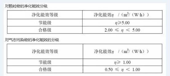 净化能效是空气净化器在额定状态下单位功耗所产生的洁净空气量,即净化器一小时所产生的洁净空气量比上净化器工作一小时所消耗的功率。国标对净化能效等级进行了相应划分及描述,详见下图: