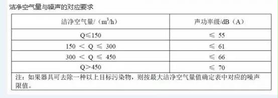 参照新国标要求,空气净化器洁净空气量大于450m3/h时,声功率级噪声需小于等于70dB(A)。