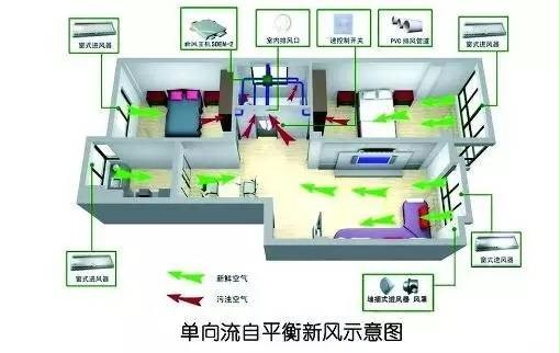 单向流系统是由风机、进风口、排风口及各种管道和接头组成的。安装在吊顶内的风机通过管道与一系列的排风口相连,风机启动,安装在室内的吸风口通过风机把浑浊的空气排出室外,在室内形成几个有效的负压区,室内空气持续不断的向负压区流动并排出室外,室外新鲜空气由安装在窗框上方的进风口不断的向室内补充新鲜空气。该新风系统的送风系统无须送风管道的连接,而排风管道一般安装于过道、卫生间等通常有吊顶的地方,基本上不额外占用空间。