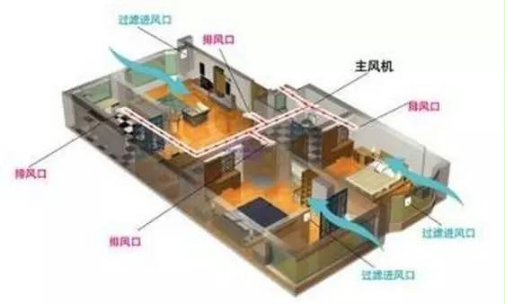 中央新风系统通过管道与新风主机连接,系统原理为,在厨房、卫生间装设排风机及排风管道等配套设施,在卧室、客厅装设进风口。排风机运转时,排出室内原有空气,使室内空气产生负压,室外新鲜空气在室内外空气压差的作用下,通过进风口进入室内,以此达到室内通风换气的目的。