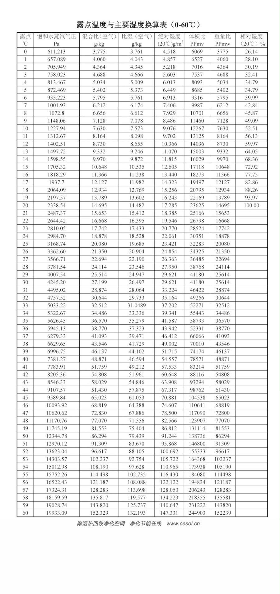 露点温度与主要湿度换算表