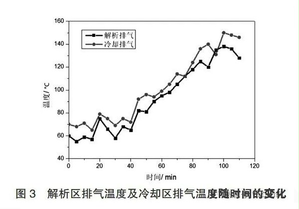 因此,通常情况下,各反应区进、出气端均设置有温度监控装置及温度异常报警装置,通过对各路气体温度实时监测,并及时反馈和控制,进而保证整个处理工艺的稳定运行。但是,在实际监测过程中,转轮解析区及冷却区排气温度偶尔会出现如图3所示。系统刚开始运行(0~40min)时,解析区排气温度始终维持在50~80℃,而冷却区排气温度始终维持在60~90℃。当运行至45min时,解析区与冷却区温度开始持续升高。至75min时,解析区排气温度高于110℃,至80min时,冷却区排气温度高于120℃,并且高于相应温度时间持续5min以上,若发生这种现象,则推断认为分子筛浓缩转轮内部发生焖烧,需要及时拆开检查,并对可能导致该现象发生的原因进行排查。因此,温度判定法是一种最直接、有效的判定分子筛转轮内部发生焖烧现象的方法。