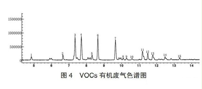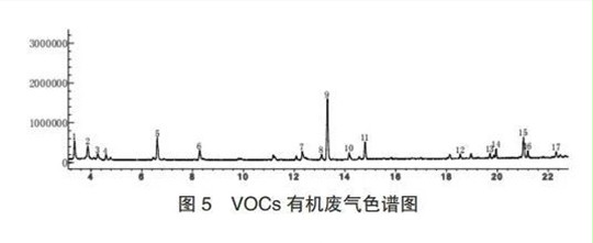 浙江某制药厂生产车间有较明显的异味,对该车间通风换气,产生大量的低浓度废气。2017年,该公司为保证排气达标,采用了一套分子筛浓缩转轮处理装置。该装置运行两年后在拆机检修时,发现转轮轮芯表面存在灼烧痕迹。为查询轮芯灼烧原因,对该项目废气进行气相色谱-质谱检测,分析结果如图5及表3所示。从数据分析看,该项目有机废气中含有高沸点(高于180℃)的有机废气分子,如6-乙基2-甲基癸烷(沸点217℃)、3-甲基十一烷(沸点217℃)等。这些物质在常规解析温度下无法发生解析,而本项目所设计的解析温度为150~180℃。