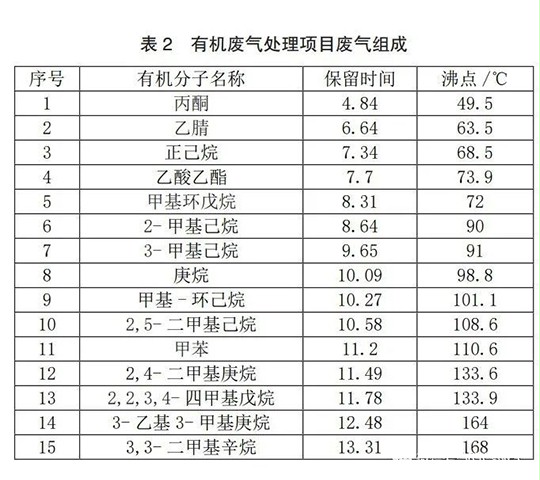 湖北某制药公司于2019年对合成车间散排废气及污水池废气使用了一套分子筛浓缩转轮处理装置,该项目转轮在运行一年后拆机检修时,发现转轮轮芯表面存在灼烧痕迹。为查询轮芯灼烧原因,对该项目废气进行气相色谱-质谱检测,分析结果如图4及表2所示。从数据分析看,该项目有机废气中含有大量低沸点(低于100℃)的有机废气分子,如丙酮、乙腈等。为满足沸点较高的有机物(如3-乙基3-甲基庚烷(164℃)、3,3-二甲基辛烷(168℃))的正常解析,设计该工艺解析温度为150~180℃。当进气中低沸点有机分子在转轮上不断吸附浓缩时,在较高的解析温度(150~180℃)下,这些有机分子就会与气体中的氧气发生氧化反应,并放出大量的热,因此会直接导致分子筛浓缩转轮内部焖烧现象的发生。由此,可以解释本项目转轮轮芯发生焖烧现象的原因。