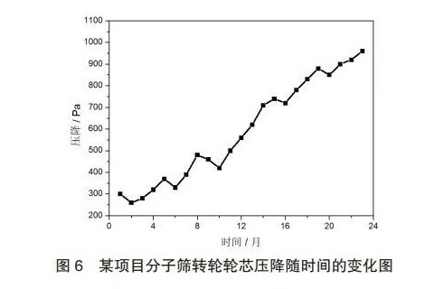 图6为河北某化工原料生产车间有机废气处理工艺中监测的分子筛转轮轮芯运行2年期间压降随时间的变化图,从图中可以看出,刚开始运行(0~12个月)时,转轮压降约200~500Pa,而运行一年后,监测的压降明显升高,最高达到1000Pa。对转轮进行停机检查,发现轮芯盘面局部发生焖烧,同时,发生焖烧区域的轮芯孔道也存在明显的堵塞现象。由此可见,转轮轮芯孔道堵塞可能是导致转轮轮芯内部发生焖烧的原因之一。分子筛转轮轮芯主要是由吸附介质(分子筛)和骨架结构(陶瓷纤维)组成,其中陶瓷纤维及轮芯块体之间使用密封胶黏连而成,因此在一定程度上容易造成骨架坍塌,进而影响了轮芯结构的稳定性。另外,虽然分子筛转轮轮芯具有规则的孔道,保证废气流通的同时能有效地降低压损,节省能耗,但是,通常情况下,该孔道尺寸相对较小,容易造成孔道堵塞。此外,转轮内部容易引起孔道堵塞的物质还包括: