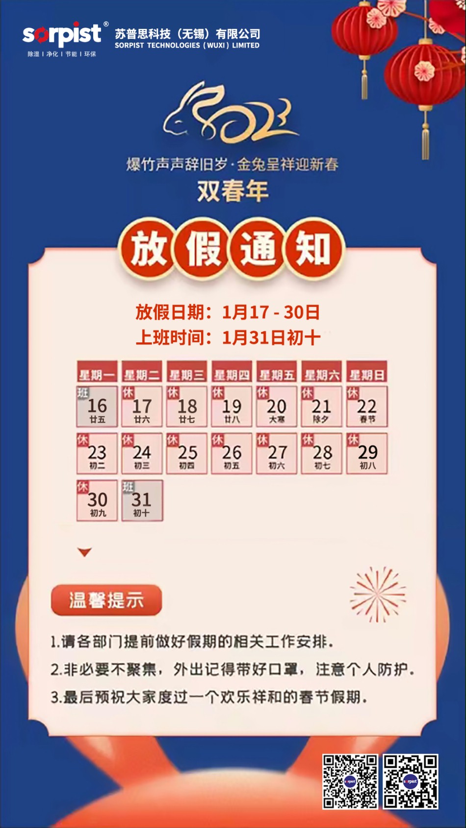 2023年春节佳期,根据国家春节假期并结合公司实际情况,本公司春节放假时间及放假期间安排,从本月17日起至30日放假,31日初十上班,共计放假14天。客户售前售后服务工作按排由专人负责,值守时间为上午10时至下午3时,接受电话咨询提供技术服务。