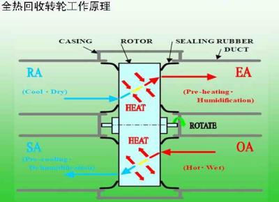 由电机驱动作旋转运动的热交换转轮,由于采用了蜂窝状结构设计,其体积虽小,却有着吸湿、蓄热的巨大接触面积和良好传热性能,是一个巨大的蓄热体,具备回收显热和潜热的优异特性。热交换转轮上半部通过室外新风,下半部通过室内排风。在寒冷的冬季,室内排风的温湿度均高于室外新风,排风通过热交换转轮时,会使热交换转轮的温度升高,水分含量增加,当转轮经过清洁隔离区转至新风区时,向室外新风释放热量与水分,使新风升温、增湿。夏季正好相反,降低新风温湿度,增高排风温湿度。